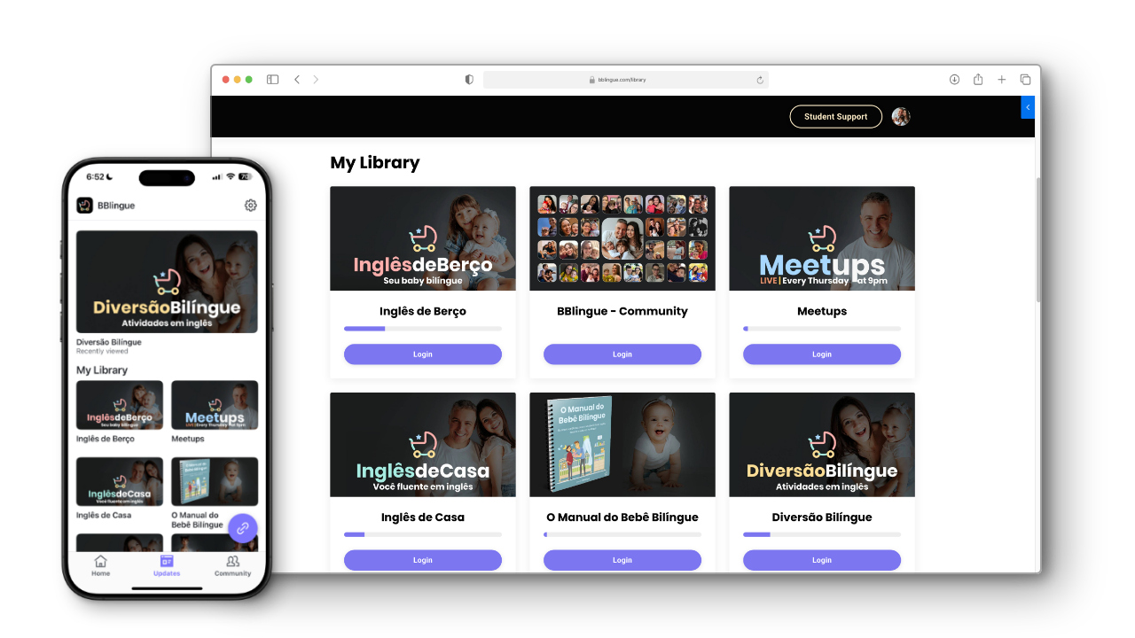 Cada rotina do playbook tem um vídeo curto no app do BBlingue mostrando exatamente como aplicar, com a pronúncia certa, no momento certo.